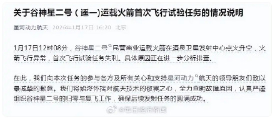 据新华社报道,1月17日00时55分,我国在西昌卫星发射中心使用长征三号乙运载火箭发射实践三十二号卫星,火箭飞行异常,发射任务失利。具体原因正在进一步分析排查。1月17日12时08分,谷神星二号民营商