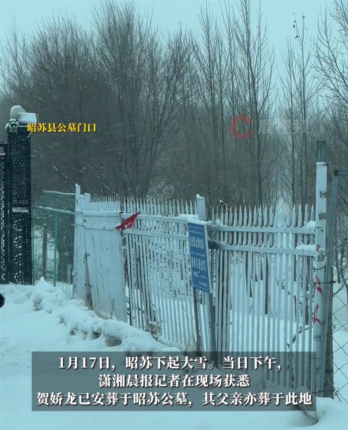 极目新闻记者陈洋洋1月17日,新疆昭苏县飘起大雪。据潇湘晨报报道,记者在现场获悉,贺娇龙已于当日下午安葬在昭苏当地的公墓。其父亲亦葬于此地。昭苏县公墓门口(图源:潇湘晨报)此前一天上午,昭苏县殡仪馆为